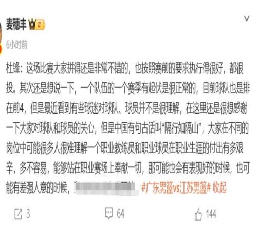賽后杜鋒罕見在發(fā)布會上喊話廣東球迷要包容球隊(杜鋒說了將近5分鐘,非常少見),還說了很多話鼓勵和肯定張皓嘉這段時間的貢獻(xiàn)。