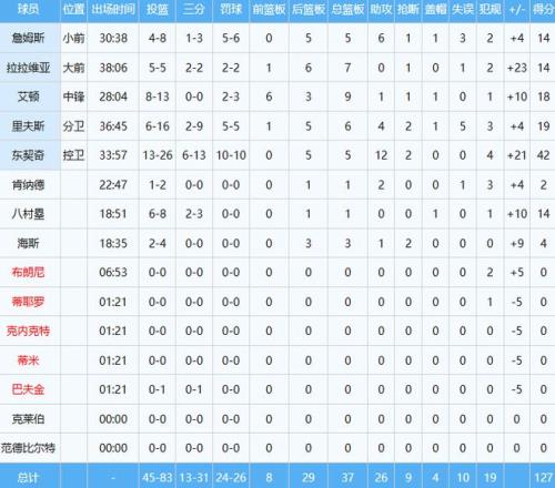 去年休賽期以兩年1200萬(wàn)美元加盟湖人的拉拉維亞表現(xiàn)出色,此役首發(fā)出戰(zhàn)約38分鐘,投籃5中5,其中三分2中2,罰球2中2,以100%命中率貢獻(xiàn)14分7板,正負(fù)值+23冠絕全場(chǎng)。