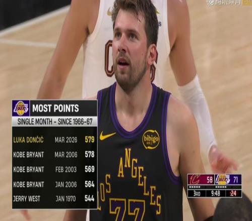 東契奇罰球命中,拿下3月份(當(dāng)?shù)貢r間)個人的第579分,超越科比(2006年3月的578分),成為湖人隊史單月得分王。