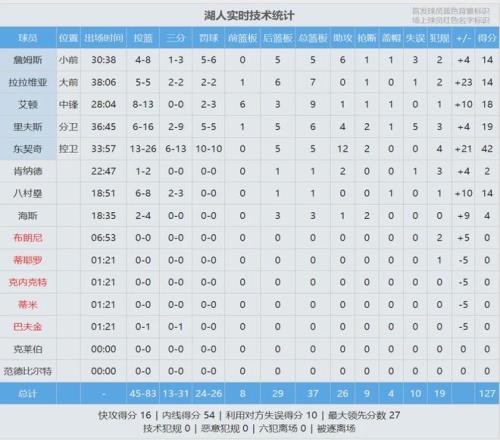 第四節(jié)騎士換上純替補(bǔ)陣容,本來要放棄比賽了。湖人自己進(jìn)攻斷電,最后5分鐘被騎士追到14分,湖人趕緊把東契奇換上場。東契奇連拿7分+1助攻,湖人再次拉開到20分。全場結(jié)束,湖人主場127-113戰(zhàn)勝騎士,最近14場,湖人13勝1負(fù)。