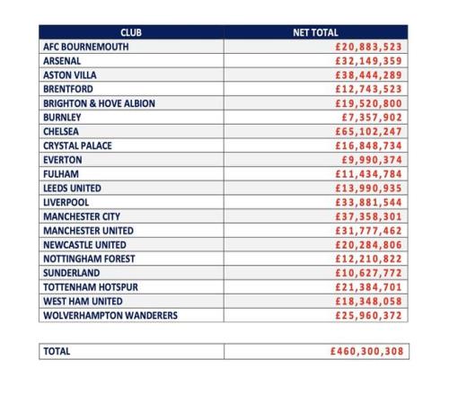 英足總統(tǒng)計(jì)英超俱樂(lè)部經(jīng)紀(jì)人傭金支出(2025年2月4日至2026年2月2日):