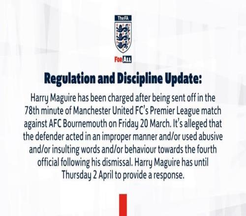 北京時(shí)間4月1日,英足總官方發(fā)布公告,曼聯(lián)球員馬奎爾因在3月20日曼聯(lián)對(duì)陣伯恩茅斯的英超比賽第78分鐘被罰下后,對(duì)第四官員存在不當(dāng)行為,已被正式提起指控。