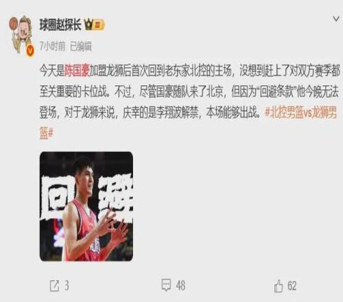 值得一提的是,本場(chǎng)比賽廣州隊(duì)球員陳國豪由于“回避條款”,從而無緣出戰(zhàn)與老東家北控隊(duì)的比賽。