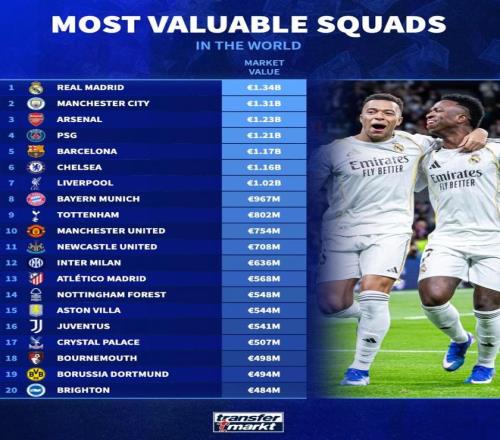 世界俱樂(lè)部身價(jià)前20:皇馬13.4億歐第1,曼城第2,阿森納第3