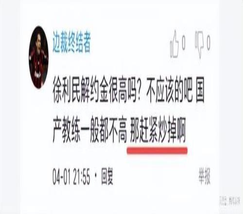球迷認(rèn)為,北京隊(duì)要換主教練 ,太不正常了,兩個(gè)超級大個(gè)被浙江搶那么多籃板。球迷說,許利民解約金很高嗎?不應(yīng)該的吧,國產(chǎn)教練一般都不高,那趕緊炒掉啊。
