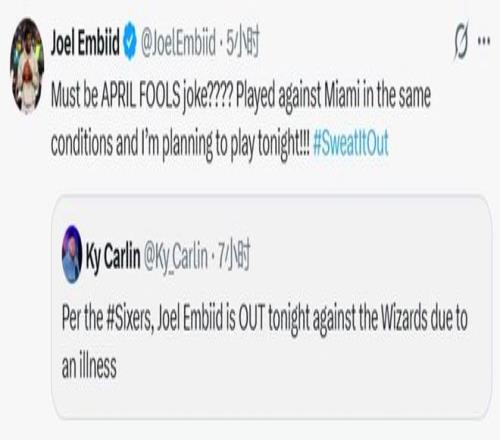 結果恩比德本人親自轉發(fā)反駁,他吐槽道:“這肯定是愚人節(jié)玩笑吧?我在同樣的條件下出戰(zhàn)了對陣邁阿密的比賽,我今晚也做好了登場的準備。”