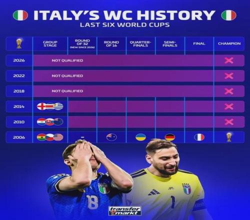 最刺目的反差,莫過于“豪華陣容”與“恥辱戰(zhàn)績”的割裂。德國轉(zhuǎn)會市場數(shù)據(jù)顯示,意大利國家隊總身價高達8.34億歐元,穩(wěn)居無緣世界杯球隊榜首,是第二名丹麥的兩倍還多,更是苦主波黑的數(shù)倍之多。手握如此頂配陣容,坐擁意甲諸強的人才底蘊,意大利卻從2006年的世界杯巔峰一路滑坡:2010、2014年小組出局,2018、2022、2026年連續(xù)三屆折戟預(yù)選賽,12年與世界杯正賽絕緣,四星榮光徹底淪為過往云煙。更具諷刺意味的是,世界排名第12位的他們,甚至不如排名80名開外的庫拉索、新西蘭能站上世界杯賽場,這份落差的背后,是意大利足球整個體系的全面崩塌。