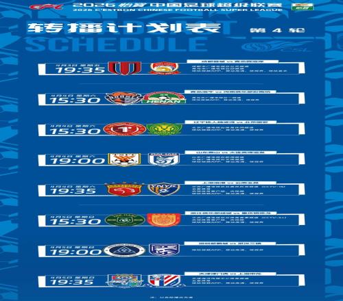 4月3日至5日,2026賽季中超聯(lián)賽將展開第4輪角逐。賽前,中超官方發(fā)布了本輪轉播計劃表。根據(jù)轉播計劃,本輪8場比賽都有網(wǎng)絡平臺直播,7場還有電視平臺直播。