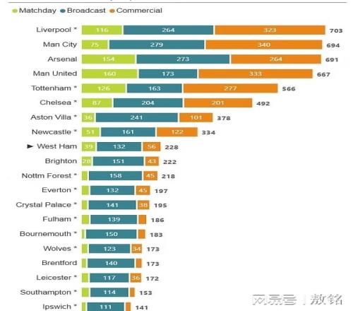 曼聯(lián)近年來雖然戰(zhàn)績不佳,品牌還在,跟利物浦確實是兩家豪門,商業(yè)贊助收入都在3.2億-3.3億這個區(qū)間,阿森納后面會逐步追上來。