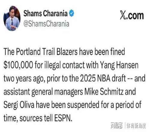 據(jù)知名爆料人Shams透露,開拓者隊(duì)因在選秀前與楊瀚森存在違規(guī)接觸行為,被NBA處以10萬美元的罰款。不僅如此,該隊(duì)的助理總經(jīng)理奧利瓦和施密茨也未能幸免,雙雙被停薪并停職兩周。隨后,開拓者隊(duì)官方迅速發(fā)表聲明,表示在得知此事后,已第一時(shí)間主動(dòng)向NBA進(jìn)行了情況報(bào)告,并全力配合相關(guān)調(diào)查工作,愿意接受聯(lián)盟的最終裁決。據(jù)美國(guó)記者Vorkunov進(jìn)一步披露,開拓者隊(duì)與楊瀚森的非法接觸發(fā)生在2023年12月,而當(dāng)時(shí)楊瀚森還不具備參加NBA選秀的資格。