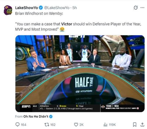 ESPN記者布萊恩-文霍斯特在評價本賽季的文班亞馬時,他表示,本賽季的wemby有希望同時拿到最快進步球員、最佳防守球員、最有價值球員,也就是三王合一。
