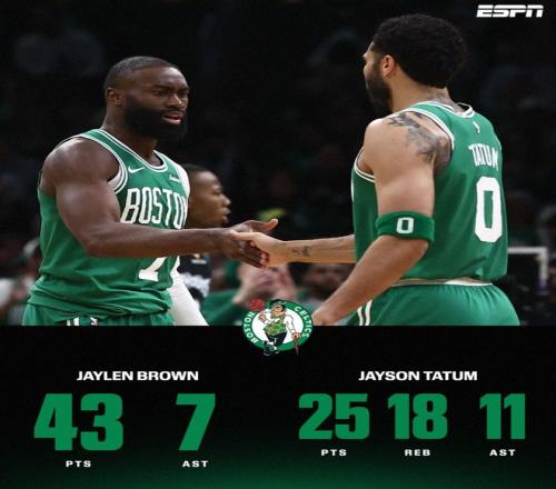 北京時(shí)間4月2日,NBA常規(guī)賽,波士頓凱爾特人147-129大勝邁阿密熱火。這場(chǎng)比賽雙探花一同登場(chǎng)了,杰倫-布朗肯定是贏球的第一功臣,他全場(chǎng)比賽37分29次出手狂攬43分7助攻3籃板,他打得‘83分先生’阿德巴約滿(mǎn)地找牙,但杰森-塔圖姆的高光更讓綠凱球迷興奮,他復(fù)出12戰(zhàn)綠凱10勝。