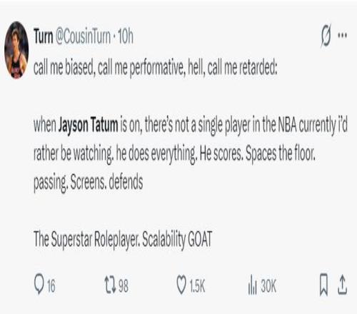 綠凱媒體:就說(shuō)我有偏見(jiàn)吧,甚至說(shuō)我腦子有問(wèn)題也行!當(dāng)塔圖姆健康狀態(tài)出色時(shí),目前沒(méi)有哪位NBA球員能比他更讓我期待,他無(wú)所不能,可以得分、能拉開(kāi)空間、能傳球、能掩護(hù)、能防守,他就是超級(jí)巨星,有望成為GOAT。