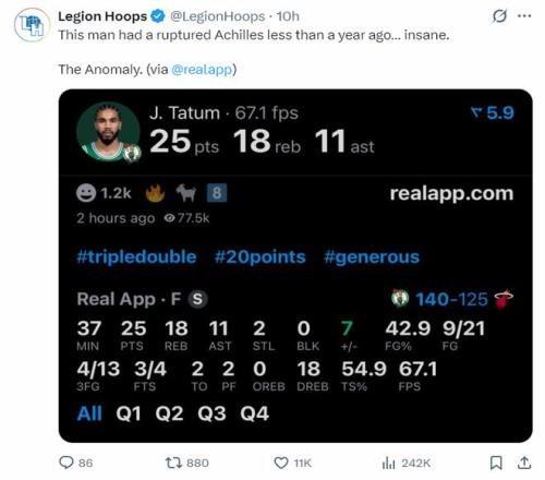 美媒LH寫(xiě)道:這位球員不到一年前剛剛遭遇了跟腱撕裂,太離譜的表現(xiàn)了。