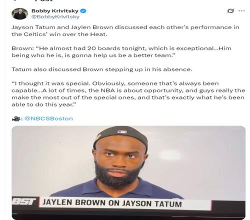 賽后布朗談到塔圖姆的表現(xiàn):他今晚快拿20個(gè)籃板了,太出色了,他就是這樣的選手,他的存在會(huì)讓我們變成更出色的球隊(duì)。