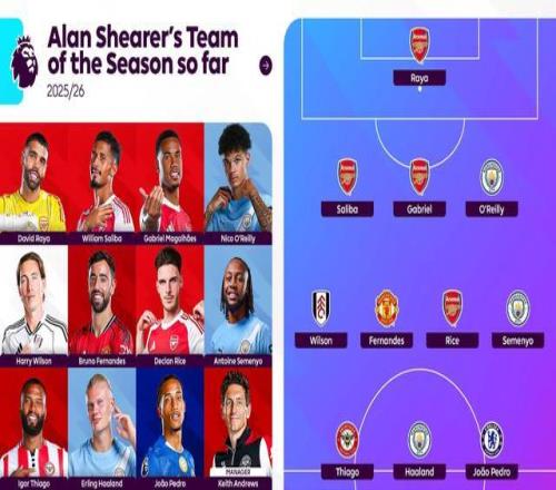 英超官方發(fā)布了阿蘭-希勒評選的本賽季至今最佳陣容,阿森納4人入選,曼城3人,布魯諾-費爾南德斯等人在列。