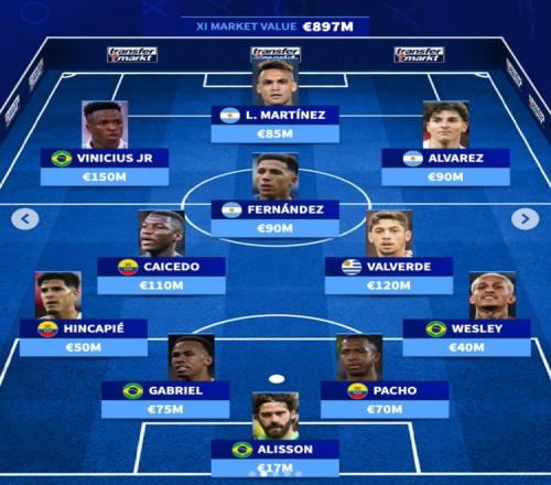 前鋒:維尼修斯(1.5億歐)、勞塔羅(8500萬歐)、阿爾瓦雷斯(9000萬歐)