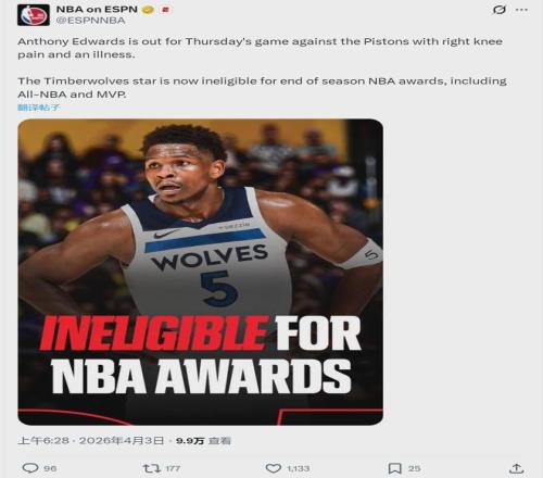 截至目前,愛(ài)德華茲打了59場(chǎng)常規(guī)賽。不算今天這場(chǎng)比賽,森林狼還有6場(chǎng)比賽要打。如果華子剩余6場(chǎng)保持全勤,不是剛好65場(chǎng)嗎?本賽季第三場(chǎng)比賽(10月27日),愛(ài)德華茲只打了3分鐘傷退,出戰(zhàn)不足15分鐘,因此并不算數(shù)。