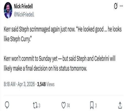 科爾確認庫里的確又打了一場隊內訓練賽,并且狀態(tài)非常好,看起來就像是斯蒂芬?guī)炖镆粯樱珟炖锶晕传@得復出許可,科爾表示庫里和隊醫(yī)會在明天做出最終決定。