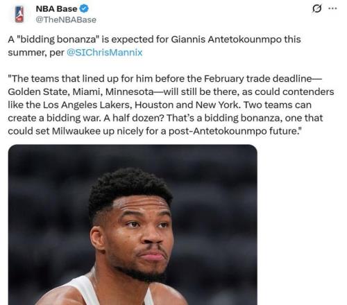 《體育畫報》記者Chris Mannix則在最新報道中指出,勇士、熱火、火箭、森林狼、湖人和尼克斯6支球隊均有意字母哥,休賽季可能引發(fā)一場競價盛宴。