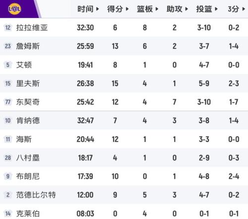 比賽早早進(jìn)入垃圾時(shí)間,布朗尼等常規(guī)替補(bǔ)獲得出場(chǎng)機(jī)會(huì)。比賽結(jié)束,湖人96-139雷霆。亞歷山大出場(chǎng)不到30分鐘,28分7板7助。湖人這場(chǎng)表現(xiàn)最低迷的球員是東契奇,10中3,三分球7中1,僅12分4板7助,還有6次失誤,是湖人輸球最大罪魁。另外詹姆斯(正負(fù)值負(fù)37)等人的表現(xiàn)也不好,湖人失利,全隊(duì)都要為這場(chǎng)慘敗負(fù)責(zé)。