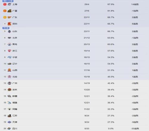 另外,排名靠后的南京、江蘇、天津、四川基本上提前無緣季后賽了。四川33連敗,這紀錄還在繼續(xù)刷新,有點離譜。而北控、廣州、吉林這三支球隊在季后賽附加賽門檻線位置瘋狂較勁,誰最后能進都不好說??偸牵@賽季上海和深圳成為了第一檔奪冠大熱,他們的出色表現(xiàn)遠遠要強于北京和廣東等球隊。