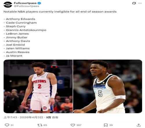 65場規(guī)則的目的,是防止球星輪休,保證球迷買票能看到人。出發(fā)點是好的,但執(zhí)行起來太僵硬。像愛德華茲這種,一場打了3分鐘傷退,也算“出場”了,但規(guī)則不認。像坎寧安這種,氣胸不是他能控制的,硬撐著打可能會出事。不撐,沒獎;撐了,可能廢。球員夾在中間,兩頭不是人。