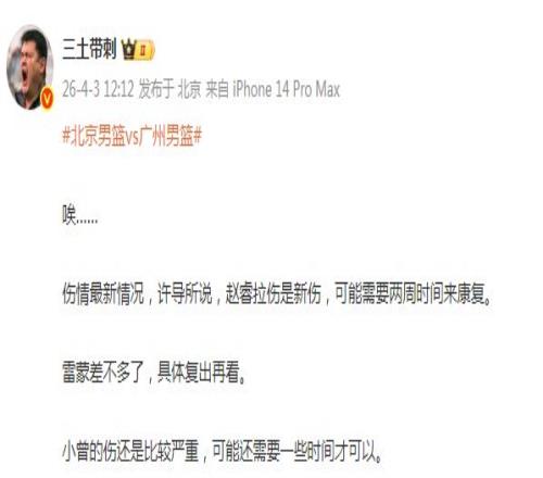 北京時(shí)間4月3日,當(dāng)趙睿在上一輪對(duì)陣浙江的賽前因傷臨時(shí)退賽,如今根據(jù)北京主帥許利民透露,趙睿的拉傷是新傷,可能需要兩周時(shí)間來康復(fù),而曾凡博與雷蒙也還在康復(fù)過程中。