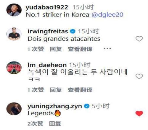 評(píng)論區(qū)中,現(xiàn)役國(guó)腳張玉寧以 “Legends” 配火焰表情留言,向兩位足壇名宿致敬。此外還有多國(guó)球迷評(píng)論,巴西球迷盛贊 “兩位偉大的前鋒”,而韓國(guó)球迷則是打趣“綠色衣服很適合他們”。