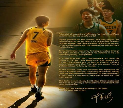 本賽季6.6分1.9板!鄧雨婷宣布離開(kāi)貝勒大學(xué)進(jìn)入轉(zhuǎn)校流程