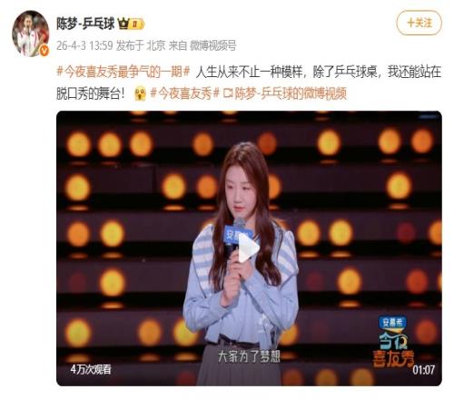 陳夢在社媒寫道:“人生從來不止一種模樣,除了乒乓球桌,我還能站在脫口秀的舞臺!”