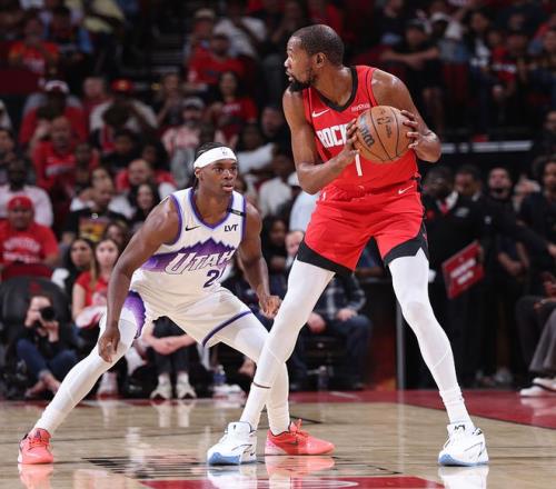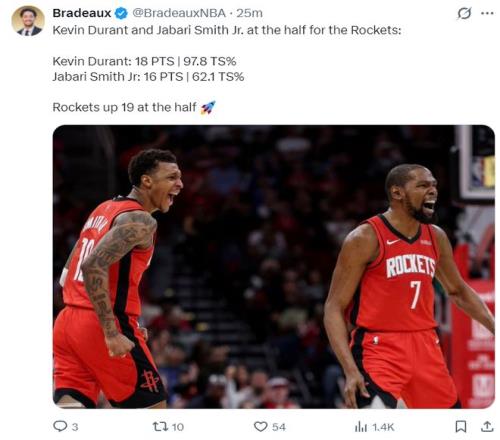 37歲的凱文-杜蘭特掃去了上一場(chǎng)16中7的陰霾,首節(jié)4中4拿到9分3助攻2籃板1蓋帽效率極高。小賈則三分2中2拿到8分1籃板,火箭球迷親切的稱這兩人為“真假杜蘭特”,他們幫助火箭大比分領(lǐng)先爵士。