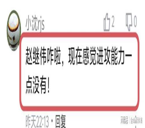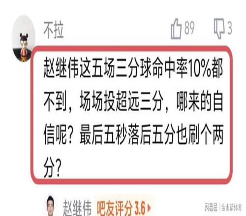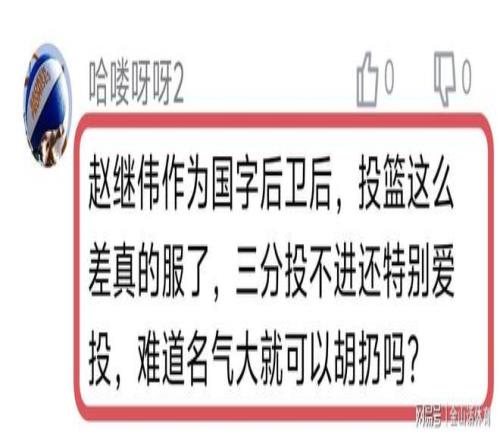 趙繼偉糟糕的手感和命中率,也被球迷們紛紛吐槽?!摆w繼偉這五場三分球命中率15%都不到,場場投超遠三分,哪來的自信呢?”;“趙繼偉咋啦,現(xiàn)在感覺進攻能力一點沒有!”;“趙繼偉和王嵐欽也不知道怎么了,比賽打著打著投籃技能包丟了,這命中率實在沒眼看了!”;“趙繼偉作為國字后衛(wèi)后,投籃這么差真的服了,三分投不進還特別愛投,難道名氣大就可以胡扔嗎?”……