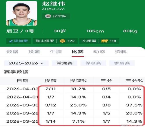 值得關(guān)注的是,趙繼偉已連續(xù)5場比賽,在進攻端持續(xù)低迷。打吉林隊一役,他14投1中,三分球7投1中;打隊福建一役,他7投1中,三分球5投1中;打廣州隊一役,他12投3中,三分球8投3中;打新疆隊一役,他7投1中,三分球4投0中;打浙江隊一役,他11投2中,三分球5投0中。5場比賽下來,趙繼偉合計51投8中,命中率不是20%;三分球合計29投4中,命中率不是15%,成了真正的“鐵匠鋪”。
