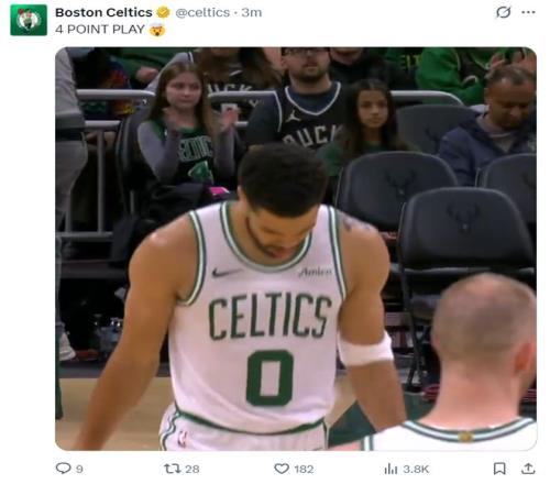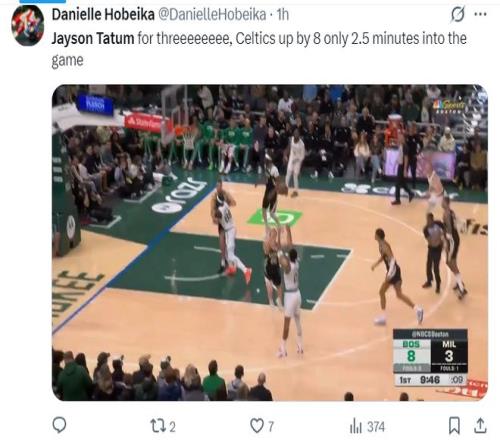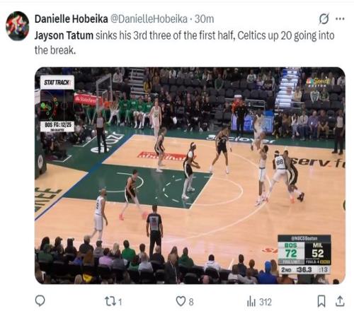第二節(jié)的塔圖姆手感有所下滑,單節(jié)7中2+三分5中1拿到5分2籃板3助攻2搶斷,半場已經(jīng)拿到14分5籃板8助攻的全面數(shù)據(jù),上半場布朗則拿到13分,雙探花繼續(xù)閃耀。