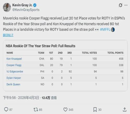 ESPN邀請(qǐng)100位體育媒體人,模擬最佳新秀投票。克尼佩爾得到80張第一選票,弗拉格得到20張第一選票!談到最佳新秀之爭(zhēng),今天賽后弗拉格表示:“希望這場(chǎng)51分有所幫助,但我不會(huì)為此擔(dān)心,我只專(zhuān)注于每晚讓自己變得更好?!?/p>