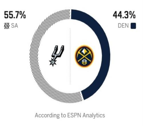 ESPN預(yù)測本場比賽勝率:馬刺55.7%,掘金44.3%。
