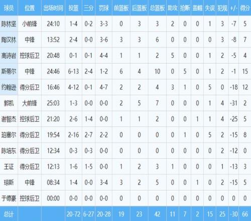 本場比賽,山東隊(duì)刷新了多項(xiàng)恥辱紀(jì)錄,面對寧波的13連勝被終結(jié),66分為賽季單場最低分,30分的分差也是本賽季最慘痛的一場失利。山東隊(duì)只有斯蒂爾表現(xiàn)出色,全場得到15分10籃板5搶斷的兩雙數(shù)據(jù),他在場時(shí),全隊(duì)僅僅輸了1分。約翰遜雖然得到12分4籃板3助攻,但出現(xiàn)了多達(dá)5次失誤,正負(fù)值為-18。其他隊(duì)員無人得分上雙,珀塞爾和瓊斯的正負(fù)值均為-15,謝智杰-25,郭凱更是達(dá)到了驚人的-31。
