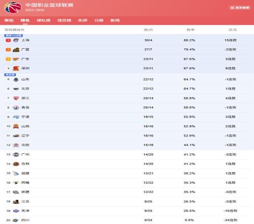 在第3爭(zhēng)奪戰(zhàn)中,山東和北京隊(duì)表現(xiàn)都有些下滑,他們也被拉開差距,落后廣東、深圳1場(chǎng)勝負(fù)差,同為22勝12負(fù),爭(zhēng)奪第5的位置!