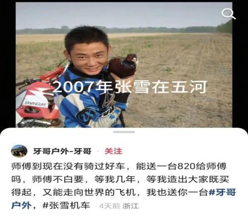 奪冠后不久,牙哥發(fā)視頻配文喊話張雪:“沒騎過好車,能送一臺820給師父嗎?”