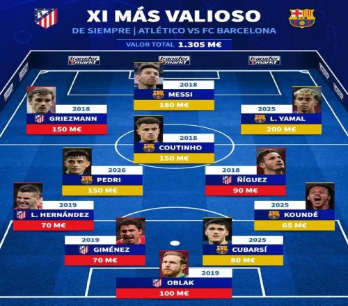北京時(shí)間4月5日,在西甲第30輪馬德里競(jìng)技和巴塞羅那迎來(lái)正面對(duì)話的情況下,德轉(zhuǎn)列出了兩隊(duì)歷史身價(jià)最高的11人陣容,梅西、亞馬爾領(lǐng)銜,格列茲曼、奧布拉克在列。