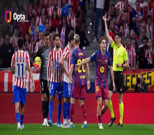 西甲第30輪,巴塞羅那客場對陣馬德里競技,上半場馬競前鋒尼古拉斯-岡薩雷斯因犯規(guī)染紅,至此,巴薩本賽季西甲已有4名對手球員在上半場被罰下,為五大聯(lián)賽并列最多。