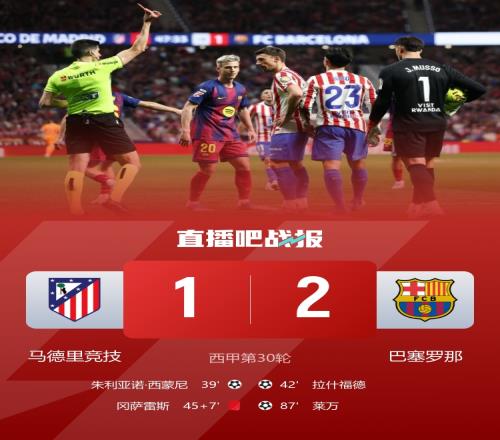 體育播報(bào)4月5日宣 北京時(shí)間4月5日凌晨3:00,2025-26賽季西甲聯(lián)賽第30輪焦點(diǎn)戰(zhàn),馬競(jìng)坐鎮(zhèn)大都會(huì)球場(chǎng)迎戰(zhàn)巴薩。上半場(chǎng)格列茲曼失良機(jī),亞馬爾中柱,朱利亞諾·西蒙尼破門,拉什福德扳平,岡薩雷斯直紅,巴薩暫1-1馬競(jìng);下半場(chǎng)馬丁直紅VAR介入后改判黃牌,萊萬(wàn)“被動(dòng)”絕殺,最終巴薩2-1十人馬競(jìng),各項(xiàng)賽事4連勝,7分領(lǐng)跑積分榜。