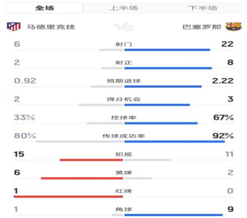 馬競(jìng)12巴薩全場(chǎng):射門(mén)622,犯規(guī)1511,黃牌62,紅牌10