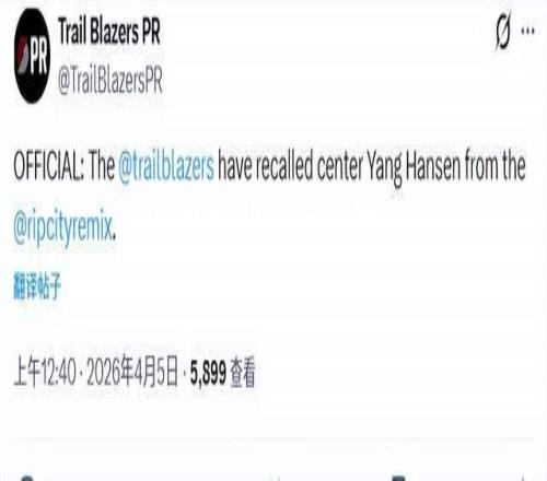 北京時間4月5日,開拓者官方宣布,球隊已將楊瀚森從G聯(lián)賽混音隊召回。昨日結束的G聯(lián)賽季后賽西部半決賽,混音95-107不敵衛(wèi)冕冠軍斯托克頓國王,楊瀚森17投9中得到20分7籃板2助攻2蓋帽。隨著混音被淘汰出局,楊瀚森本賽季的G聯(lián)賽之旅也就此結束。