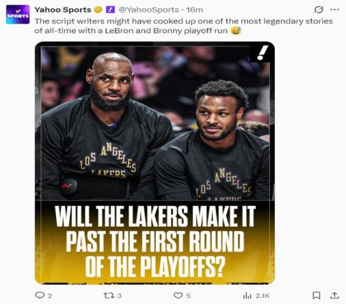 《雅虎體育》還調(diào)侃:這些NBA的編劇們創(chuàng)作出了有史以來(lái)最傳奇的故事之一,湖人季后賽包含了勒布朗與布朗尼的父子同臺(tái)。