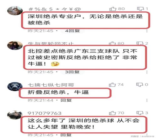 絕殺與反絕殺,賽后球迷們也是嗨成一片?!岸颊f別半場開香檳,2.6秒你也別開”;“到底誰晚安?”;“深圳絕殺專業(yè)戶,無論是絕殺還是被絕殺”;“北控差點(diǎn)絕殺廣東三支球隊(duì) 只不過被史密斯反絕殺給拒絕了 非常牛逼!”;“折疊反絕殺,牛逼!”;“這么多年了 深圳的絕殺球 從不會讓人失望 里勒晚安!”……