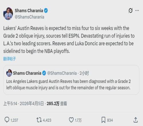 北京時(shí)間4月5日凌晨,據(jù)NBA名記Shams報(bào)道,湖人后衛(wèi)奧斯汀-里夫斯因二級(jí)腹斜肌拉傷,將缺席4到6周。里夫斯跟東契奇一樣,不僅常規(guī)賽報(bào)銷,也將缺席季后賽首輪。本賽季東契奇和里夫斯場(chǎng)均合砍57分,占全隊(duì)得分48.9%。