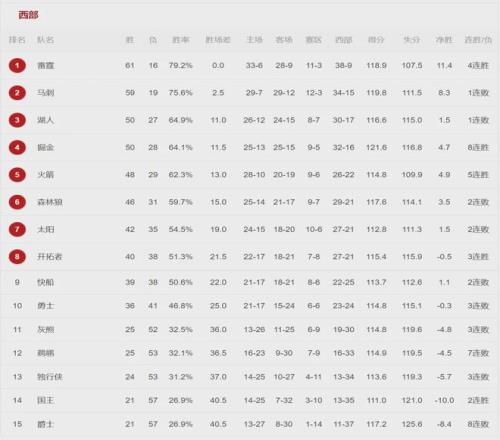 目前湖人50勝27負(fù)仍居西部第三,領(lǐng)先第四掘金0.5個(gè)勝場(chǎng),領(lǐng)先第五火箭2個(gè)勝場(chǎng),領(lǐng)先第六森林狼4個(gè)勝場(chǎng),領(lǐng)先第七太陽(yáng)8個(gè)勝場(chǎng)。湖人還剩5場(chǎng)比賽,肯定不會(huì)掉到附加賽區(qū),最好的結(jié)果是保住第三,最壞的結(jié)果是淪為第六。