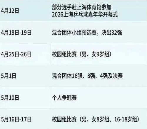 ·4月25-26日,混合團(tuán)體冠軍聯(lián)賽楊浦區(qū)選拔賽。將選拔優(yōu)秀選手組成楊浦區(qū)代表隊(duì)參加市級循環(huán)賽。選拔賽主會場位于復(fù)興島船臺PARK,周邊將同步舉辦乒乓球嘉年華市集活動——親子乒乓挑戰(zhàn)賽、趣味乒乓運(yùn)動體驗(yàn)、特色商戶攤位。